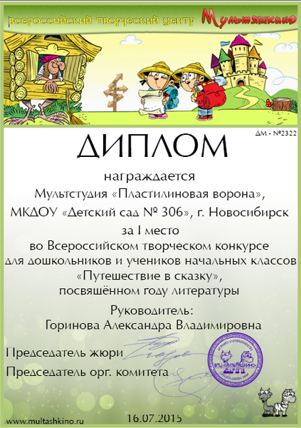 - Диплом за I место во Всеросийском конкурсе для дошкольников и учеников начальных классов "Путешествие в сказку", посвящённом году литературы (за пластилиновый мультфильм "Колобок на новый лад"), коллектив мультстудии "Пластилиновая ворона";