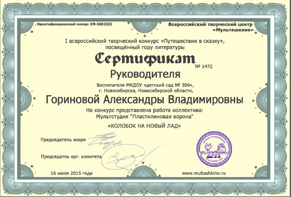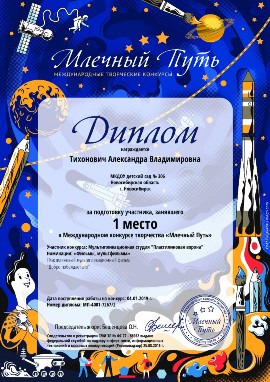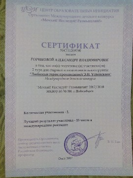 - Сертификат Международного детского конкурса "МЕЧТАЙ! ИССЛЕДУЙ! РАЗМЫШЛЯЙ!" 2017/2018, 2 тур для старшей и подготовительной группы "Любимые герои произведения Э.Н. Успенского". Организатор: Центр образовательных инициатив, Сибирский институт неприрывного дополнительного образования, г.Омск;