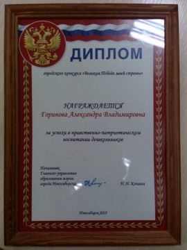- Диплом городского конкурса "Великая Победа моей страны" (I место в номинации "Рисунок" занял мой воспитанник Егор Колязов);