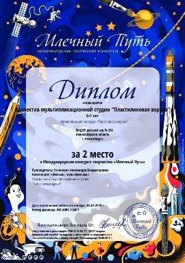 - Диплом за II место ежегодного октрытого регионального детско-юношеского конкурса образовательных проектов литературного, художественного, экранного творчества и декламации "СИБИРСКИЕ ИСКРЫ" в номинации "Проекты экранного творчества" награждается коллектив мульт-студии "Пластилиновая ворона" за мультильм "Ворона и лисица" ( по одноименной басне И.А. Крылова), 2019 г.