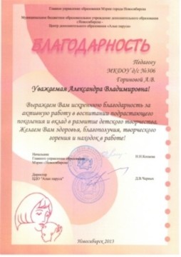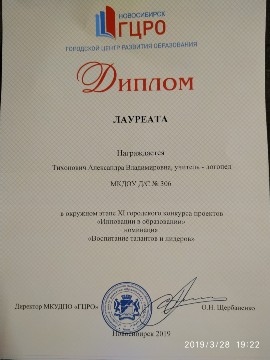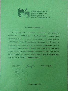 - Благодарность администрации Новосибирского педагогического колледжа №1 им. А.С. Макаренко за проведение практического занятия для слушателей программы повышения квалификации "Деятельность воспитателя в условиях введения ФГОС ДО" по теме: "Проектная деятельность в ДОО. Утренний сбор";