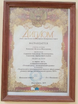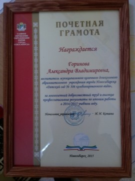 - Почётная грамота. Главное управление образования Мэрии города Новосибирска 2014/2015 учебный год;