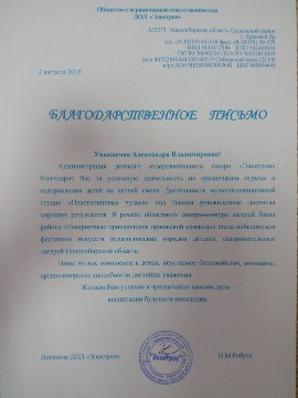 - "Большой ОСКАР" на Фестивале детских оздоровительных лагерей "Из лета в лето", в номинации "Фильм" (ДОЛ "Электрон"), коллектив мульстудии "Пластилиновые чудеса";