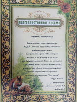 - Благодарственное письмо Всероссийского народного экологического движения "Круг жизни" (за сбор мукулатуры дети моей группы получили саженцы, которые мы посадили на своём участке).
