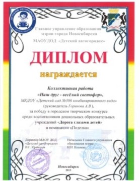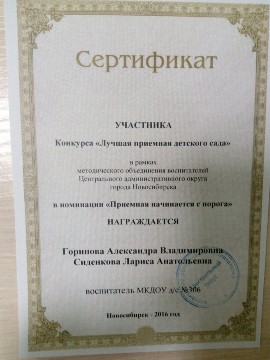 - Сертификат участника конкурса "Лучшая приёмная детского сада" в рамках методического объединения воспитателей Центрального административного округа города Новосибирска, в номинации "Приёмная начинается с порога", 2016'