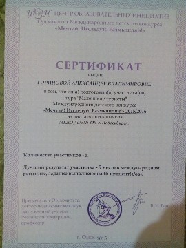 - Сертификат Международного детского конкурса "МЕЧТАЙ! ИССЛЕДУЙ! РАЗМЫШЛЯЙ!" 2015/2016, 1 тур "Маленькие туристы". Организатор: Центр образовательных инициатив, Сибирский институт неприрывного дополнительного образования, г.Омск, 2015;