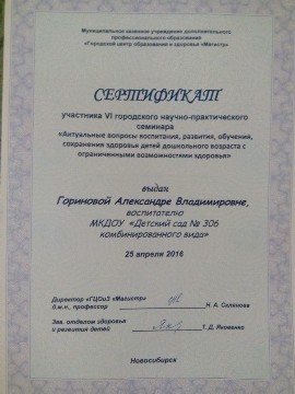 - Сертификат участника VI городского научно-практического семинара "Актуальные вопросы воспитания, развития, обучения, сохранения здоровья детей дошкольного возраста с ограниченными возможностями здоровья";