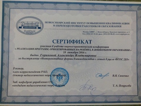 - Сертификат участия в работе научно-практической конференции "Реализация программ, ориентированных на ребёнка в дошкольном образовании", за выступление "Интерактивные формы взаимодействия с семьёй в русле ФГОС ДО" (был представлен опыт работы "Коррекция детско-родительских отношений. Организация детско-родительского клуба "Мы-вместе"), 2016 г;