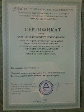 - Сертификат Всероссийского детского конкурса по основам жизнедеятельности "ПРОСТЫЕ ПРАВИЛА" 2015/2016. Организатор: Центр образовательных инициатив, Сибирский институт неприрывного дополнительного образования, г.Омск, 2016;