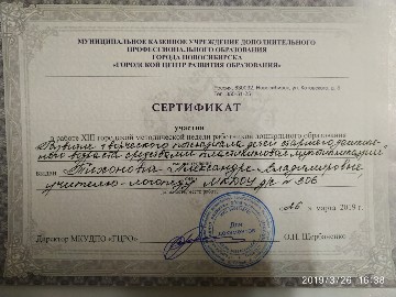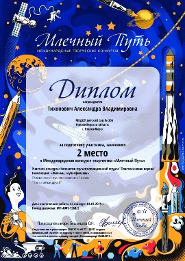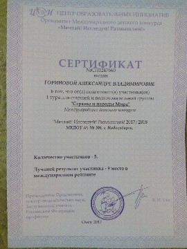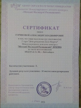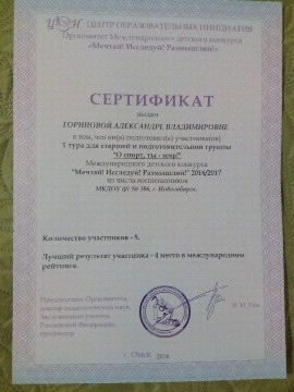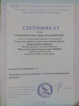 - Сертификат Международного детского конкурса "МЕЧТАЙ! ИССЛЕДУЙ! РАЗМЫШЛЯЙ!" 2016/2017, 1 тур для старшей и подготовительной группы "О спорт, ты - мир!". Организатор: Центр образовательных инициатив, Сибирский институт неприрывного дополнительного образования, г.Омск, 2016.