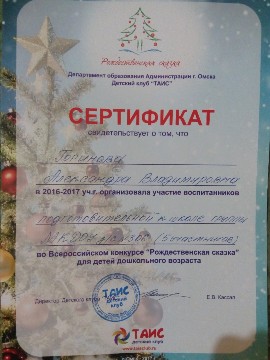 - Сертификат Всероссийского конкурса "Рождественская сказка" 2016/2017. Организатор: Депортамент образования Администрации г.Омска Детский клуб "ТАИС", 2017;