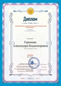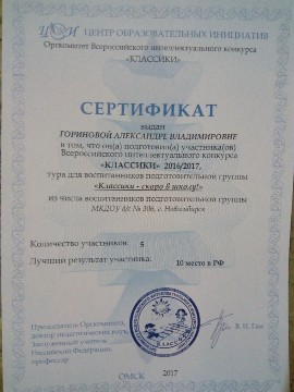 - Сертификат Всероссийского интеллектуального конкурса "КЛАССИКИ" 2016/2017, тур для воспитанников подготовительной группы "Классики - скоро в школу!". Организатор: Центр образовательных инициатив, Сибирский институт неприрывного дополнительного образования, г.Омск, 2017;