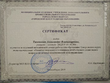 - Сертификат участия в работе XIII городской методической недели работников дошкольного образования, тема выступления: "Развитие творческого потенциала детей старшего дошкольного возраста средствами пластилиновой мультипликации";