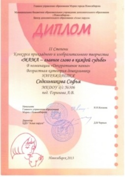 - Сертификат Международного детского конкурса "МЕЧТАЙ! ИССЛЕДУЙ! РАЗМЫШЛЯЙ!" 2015/2016, 2 тур для старшей и подготовительной группы "День рождение Деда Мороза". Организатор: Центр образовательных инициатив, Сибирский институт неприрывного дополнительного образования, г.Омск;
