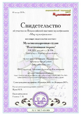 - Свидетельство об участии во Всероссийской выставке мультфильмов "Мир мультфильмов" (на выставке в номинации "Мультфильм" была представлена работа "Добро побеждает зло" (2018);