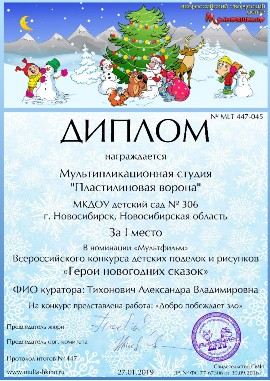 - Диплом за I место в номинации "Мультфильм" Всеросийского конкурса детских поделок и рисунков "Герои новогодних сказок" (за пластилиновый мультфильм "Добро побеждает зло"), коллектив мультстудии "Пластилиновая ворона";