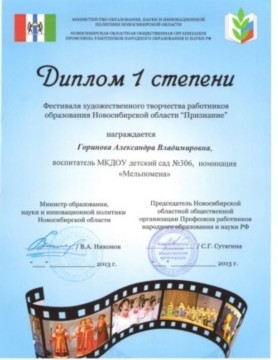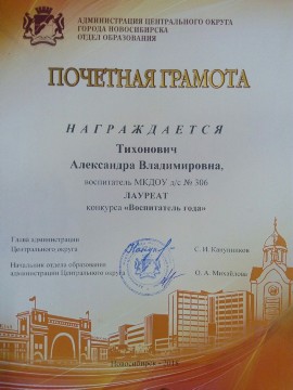 - Почётная грамота Администрации Центрального округа города Новосибирска отдел образования - лауреат конкурса "Воспитатель года".