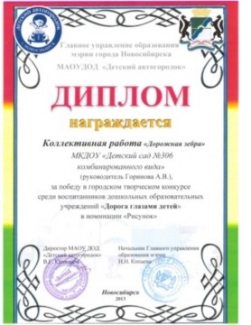 - Сертификат участника в городском конкурсе "Образ жизни - здоровье", номинация: Педагогический проект "Сотрудничество педагогов с родителями" (в составе творческой группы МКДОУ д/с № 306);