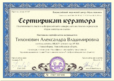 - Сертификат Всероссийского интеллектуального конкурса "КЛАССИКИ" 2015/2016, тур для воспитанников подготовительной группы "Классики - скоро в школу!". Организатор: Центр образовательных инициатив, Сибирский институт неприрывного дополнительного образования, г.Омск, 2016;